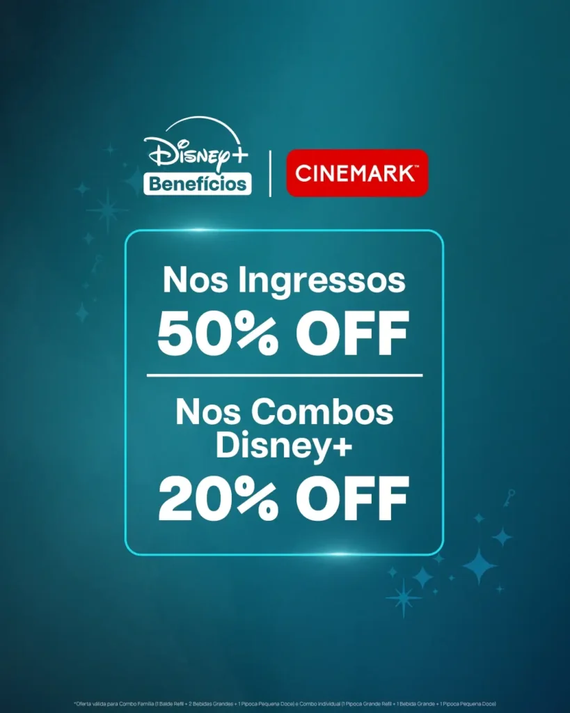 Os assinantes do Disney+ passam a contar, neste mês de dezembro, com benefícios especiais na rede de cinemas Cinemark em todo o Brasil, prontos para curtir os próximos lançamentos dos estúdios nas salas da rede. O primeiro deles é o desconto de 50% nos ingressos para sessões de filmes em salas 2D, 3D e XD (de segunda a domingo) e para Salas Prime e Poltronas D-BOX (segunda e terça, exceto feriados, em cinemas selecionados), conforme condições do regulamento. Os assinantes da plataforma também contam com 20% de desconto em combos selecionados da bomboniere, incluindo: