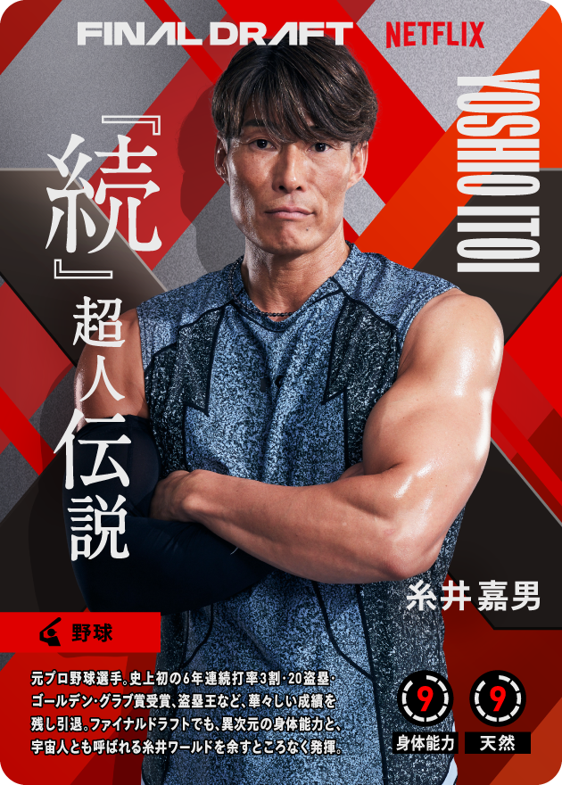 Apelidado de “Super-humano”, Itoi é uma lenda do beisebol japonês, reconhecido pela sua velocidade, forte braço e consistência no ataque. Conquistou vários prêmios Golden Glove e Best Nine e foi um jogador chave para a seleção japonesa no World Baseball Classic de 2013. Aposentou-se em 2022 após 18 temporadas. Seu carisma é inegável, tornando-o um dos grandes atrativos do show.