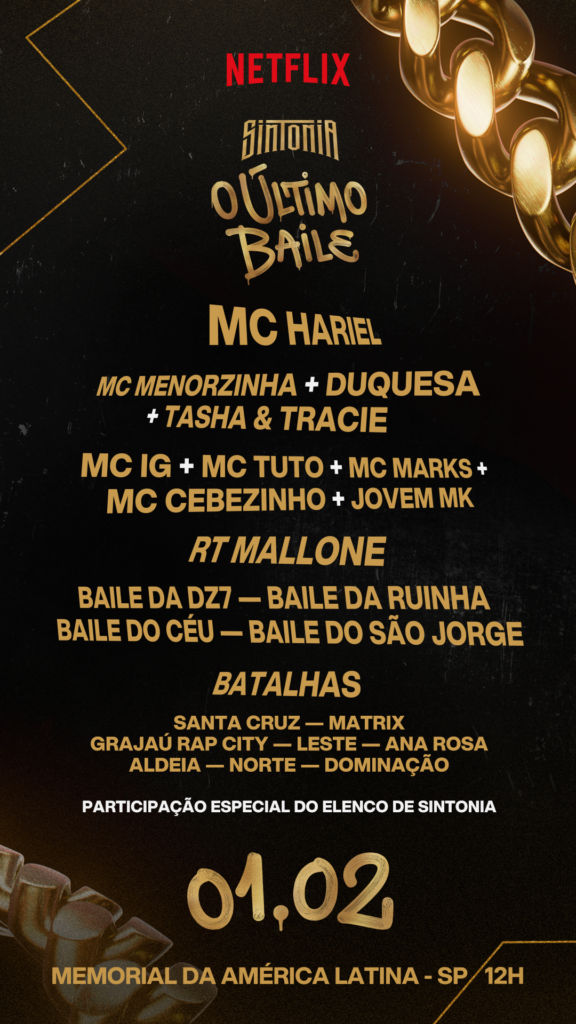 A Netflix anunciou o festival Sintonia – O Último Baile, que marcará a despedida da quinta e última temporada da série de sucesso. O evento será realizado no Memorial da América Latina, em São Paulo, e promete uma celebração à altura da trajetória da produção. Com entrada gratuita, a festa reunirá grandes nomes da música e o elenco da série em uma experiência imersiva.